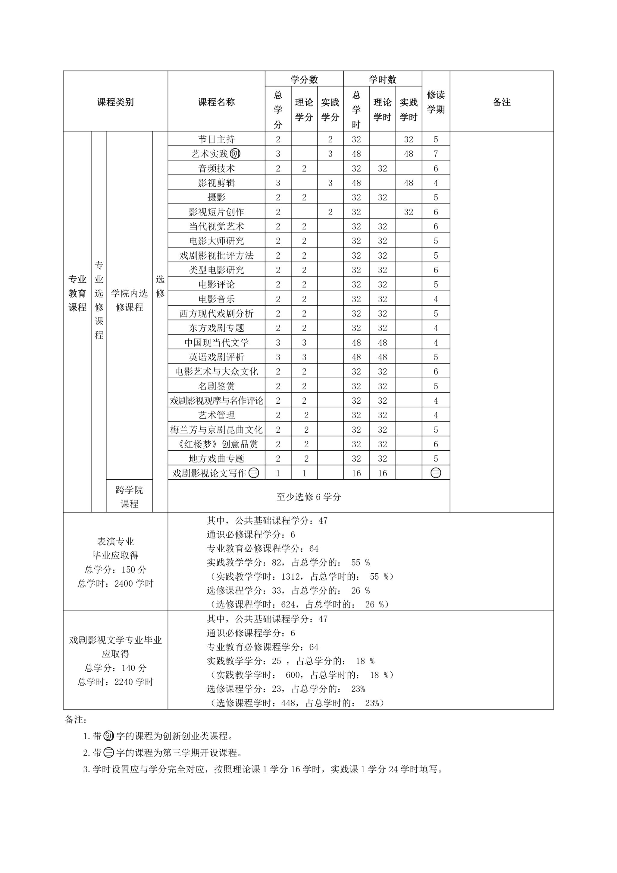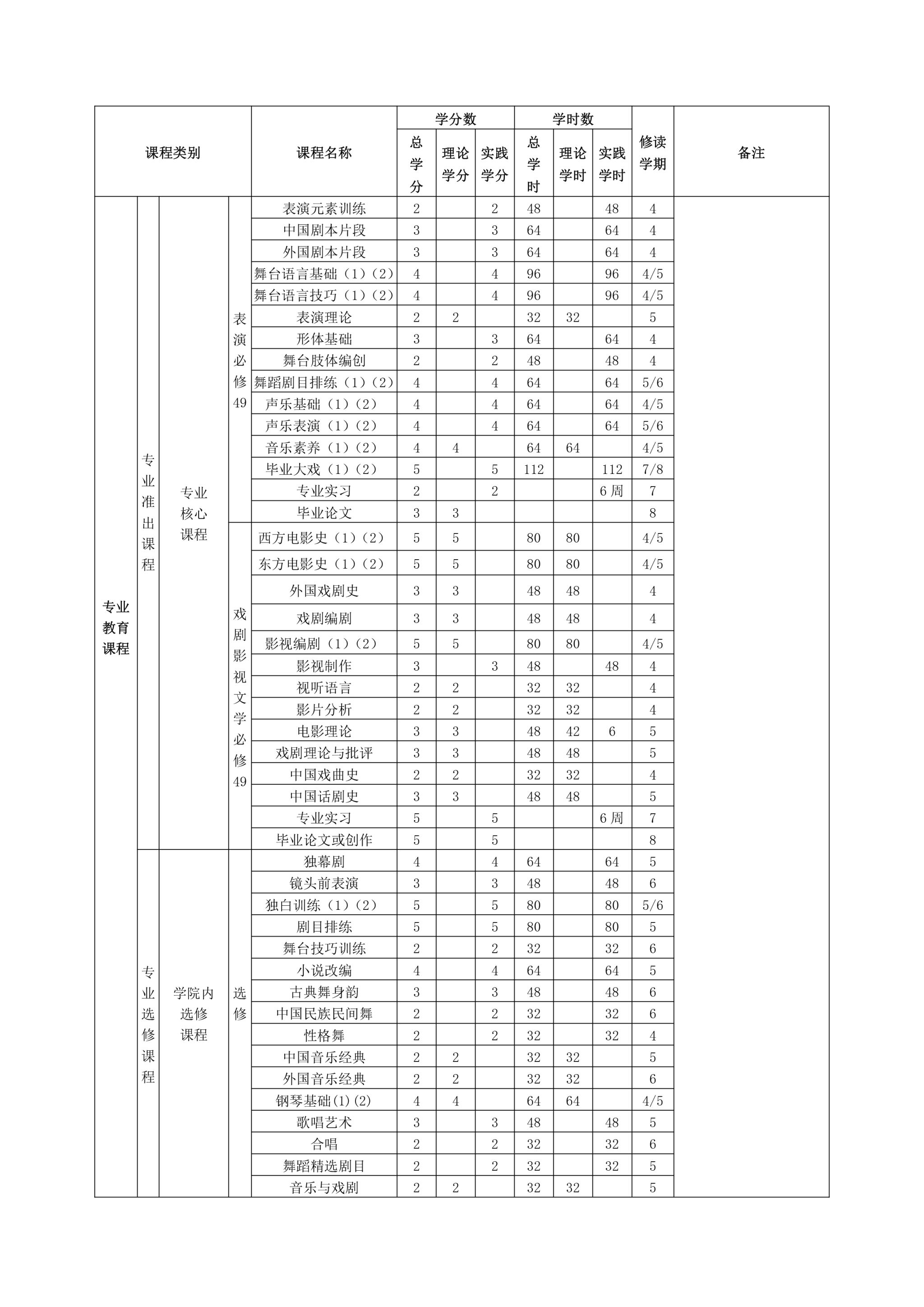 学分要求: 本大类中,戏剧影视文学专业要求修满 140 学分方能毕业, 表演专业要求修满 150 学分 方能毕业。