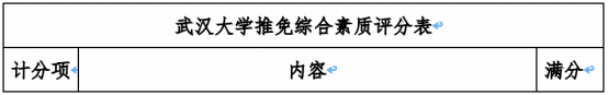 8、“综合素质评分”合格。坚持德智体美劳全面衡量,以德为先,把学生思想品德考核作为推免生遴选的首要依据,思想品德考核依据《武汉大学推免综合素质评分表》进行评分,满分为100分,得分之和低于60分或单个计分项得分低于该项满分60%的学生不能获得推免资格。(综合素质评分仅为资格条件,不计入综合评分)。