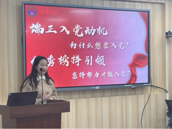 2023级戏剧影视文学专业本科生张紫瑜通过她在湖北黄石潘翔小学用电影和艺术为孩子们送上别开生面的艺术课和在河北衡水中学为学弟学妹们宣讲的学习指导的事迹和她推动武汉大学文体活动发展和志愿服务的实践经历,讲述了她的入党心路历程。她感触颇深,分享了自己在这一年里思想上更加成熟,行动上更加坚定,追求入党的道路上有了更明确的方向的感想,并以此激励同学们,每一次经历都是成长的机遇,我们要勇敢地去尝试、去探索,用心去感受其中的意义与价值。