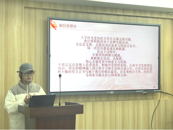 2023级表演专业本科生覃诗源展示了她对为什么想要入党和怎样努力才能入党这两个问题的理解与回答和她在这一年里取得的成就。她向同学们宣讲了自己通过“日拱一卒,功不唐捐”的努力和“志在心中,愿在行动”的志愿服务精神,在思想品德、学生工作、社会服务和志愿活动三个方面所取得的成绩,并用自己的亲身经历激励大家上下求索,以实际行动书写对党的热爱和坚持。