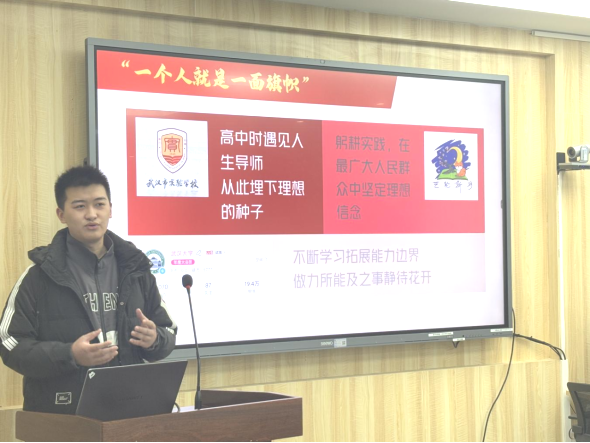 2022级表演专业本科生代安融从习近平总书记的话语出发,讲述了他从高中时期至今的入党心路历程,通过不断学习,不断探索坚定了自己“每个人都是一面旗帜”的入党理念。随后,他通过自己基于学生工作、志愿服务和能力培养三个方面的实践和探索展示了自己在入学以来取得的成就和感动,并以自己的经历为鉴,激励同学们“仰望星空,脚踏实地”,为争取早日入党和实现自己的人生目标而不断进步,不断奋斗。