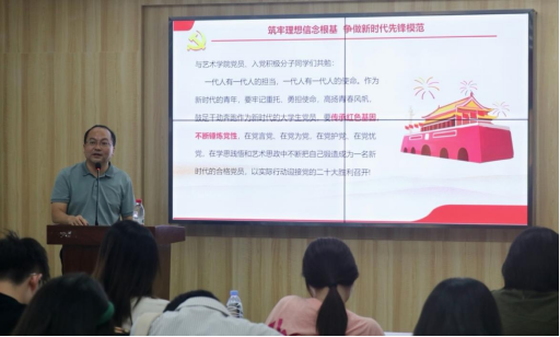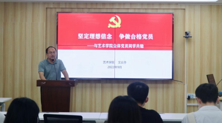 本网讯(通讯员:周一婷)为迎接党的二十大胜利召开,引导学生树立正确的理想信念、端正入党动机。2022年9月29日下午,学院党委书记文云冬为艺术学院全体入党积极分子讲授了主题为“坚定理想信念,争做合格党员”的党课。