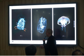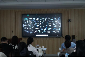 如果说危怡教授编织了一张人物造型艺术的视觉之网,那么陆长河教授则是将镜头对准人类难以触及的深海,为在座学子呈现了一场光怪陆离的深海视觉盛宴。在引入“黑水摄影”前,陆长河老师向大家普及了潜水与水下摄影的基础知识,水下摄影通常分为艺术摄影和纪录摄影,拍摄对象主要分为水下人物、水下环境和水下生物。而黑水摄影利用了海洋生物垂直迁徙的习性,在夜间的海洋摄影师有概率拍摄到正在迁徙的深海生物。因为特殊的环境限制,拍摄的照片一般只有前景,海洋生物被灯光照亮,周围一片漆黑,“黑水摄影”也由此得名。