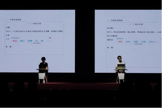 观众进入剧场落座后又见大幕打开,唯有两套桌椅和两台笔记本电脑分别笼罩在两束追光下,随后钟良和胡悦然二人皆身着日常服装来到桌前坐下,翻开笔记本电脑,同时为各自《将军之死》《圣女贞德》毕业大戏论文开题报告奋笔疾书,此场景宛如去年今日,这也正是本场正戏的前传。