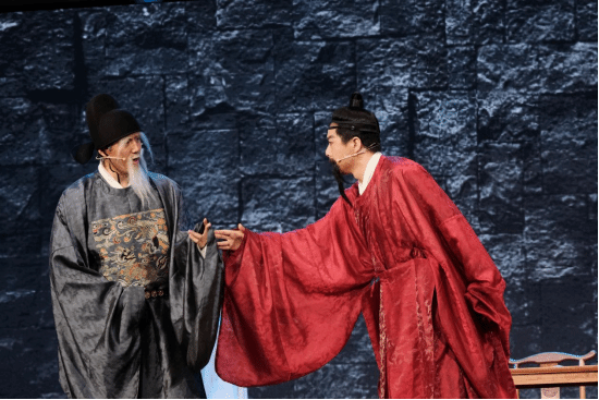 大幕关闭后,传出导演钟良在幕后骂骂咧咧的抱怨,给观众暗示了当下人文馆排练场的时空。大幕再拉开时,钟良已换上戏服“粉墨登场”,以明末蓟辽督师袁崇焕的角色身份带着大家走进崇祯年间的天牢,以老生唱腔“自报家门”,随后在和龚超同学扮演的内阁宰辅成基命的对话中,开启了袁崇焕被诬陷下狱的历史故事。