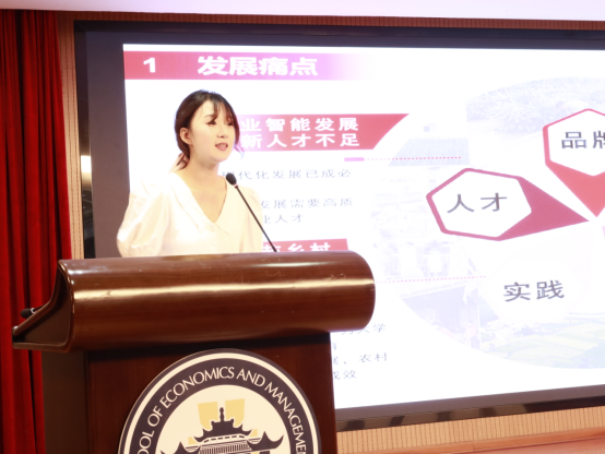 来自武汉大学女性乡村振兴创业团队“他乡遇故知”团队负责人杨若翎分享了她的团队与项目 。这是一个联合华中七校创建的乡村振兴品牌推荐平台,平台上接乡村企业,下接高校学生,针对乡村问题五大痛点,为乡村振兴作出实际贡献。平台针对乡村人才不足,技术落后问题开展引才回流活动,切实运用大学生专业能力解决乡村具体问题,并给大学生提供田野实践经验。同时,大学生运用专业技能,可以帮助品牌解决营销缺乏故事化、缺乏时代语境、难以引起共鸣的现状。她们采用多种新媒体手段、开展各类活动来进行品牌宣传和营销。更重要的是,面对乡村地区普 遍存在的信息闭塞与政策落后,平台开设信息集中站服务,致力于打破信息壁垒,为乡村品牌提供集中有效的政策信息。