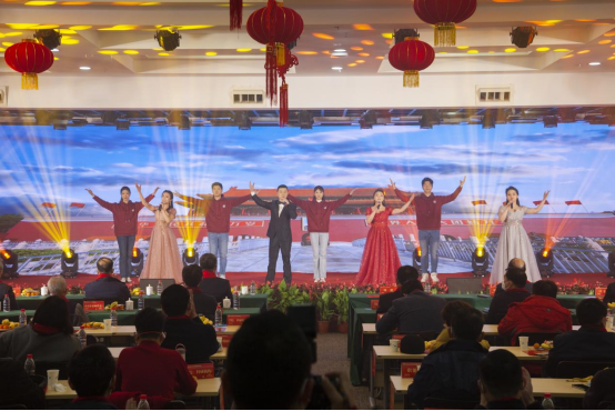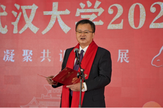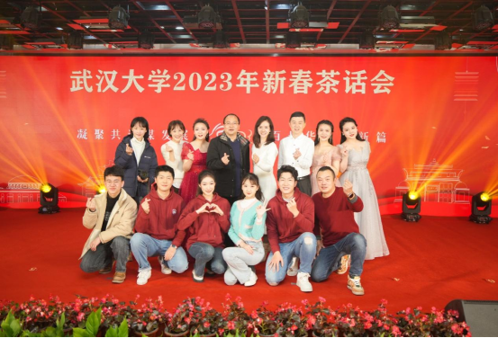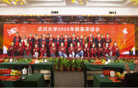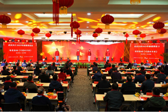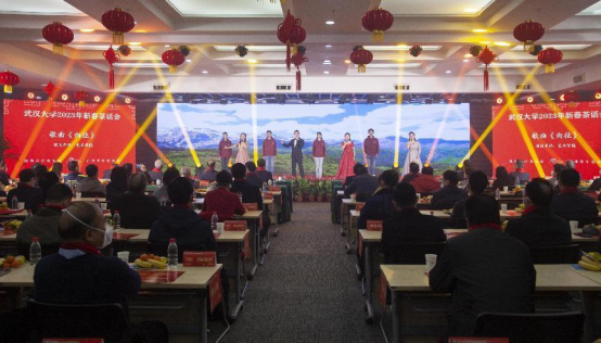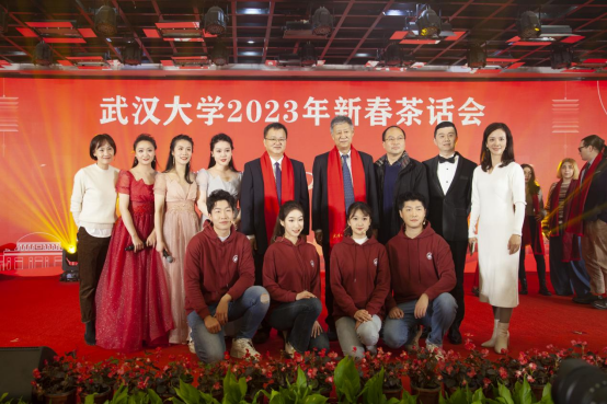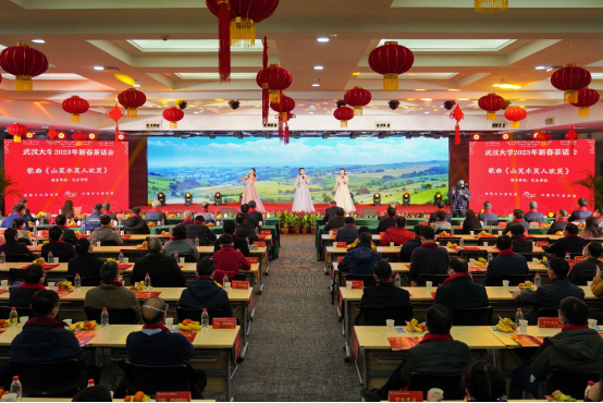 2023年武汉大学新春茶话会在歌曲《山笑水笑人欢笑》中拉开帷幕,艺术学院学生张雪黛、张诗晴、张圣星倾情演唱,在喜庆的氛围中,艺术而巧妙地传达着习近平总书记提出的“绿水青山就是金山银山”的重要发展理念。用中国的音乐语言与亲和的方式讲述绿色发展理念,描绘祖国“山笑、水笑、人欢笑” 的美丽画卷,精彩绝伦的演出和同学们积极向上的精神面貌赢得现场阵阵掌声。