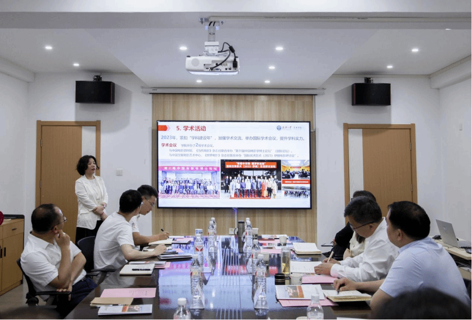 艺术学院院长、艺术教育中心主任孟君教授进行工作汇报。她以近年来全国艺术学科的变化和前不久我院赴北京大学等全国12所重点大学艺术院系进行考察调研为基础,介绍了艺术学院的历史概况、师资队伍、学科建设、人才培养、美育教育等方面的情况,总结了学院近年来的工作亮点和所取得的成绩,明确了学院面临的机遇、挑战以及自身的优势和劣势,特别是与全国重点大学艺术院系相比我院在资源配置、师资队伍、学科建设、人才培养、合作交流等方面存在的差距,提出了补短板、强弱项、求发展的意见和建议。同时还对艺术教育中心发展情况进行了汇报。