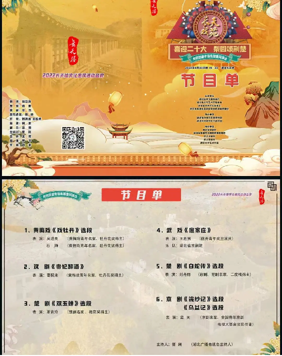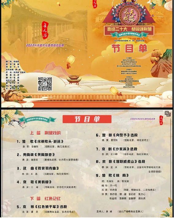 本网讯(通讯员:雷芯蕊 曾雅婷 洪一鸣)为庆祝中华人民共和国成立73周年、迎接党的二十大胜利召开,进一步推进新时代精神文明建设。由湖北省文化和旅游厅、湖北省文学艺术界联合会、湖北省中华文化促进会、武汉市东湖生态旅游风景区听涛管理处主办,湖北省中华文化促进中心、湖北长天楼文化交流中心承办,湖北省京剧院、湖北省戏曲艺术剧院黄梅戏剧团、武汉汉剧院、武汉楚剧院、乐动登陆入口协办的喜迎二十大 梨园颂荆楚——2022年“长天戏苑”经典戏曲专场、传统戏曲专场东湖惠民演出于9月29号、30号在长天楼剧场举行。