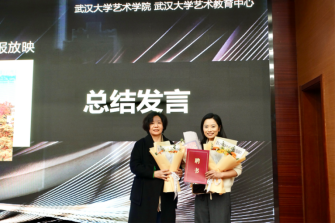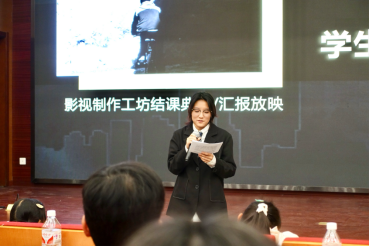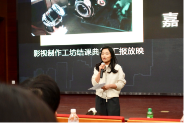 影视制作工坊的“灵魂导师”许世悦老师上台发言。她深情回顾了工坊的教学历程,分享了学生们在学习过程中的点滴成长与蜕变。许老师的话语中充满了对武大艺院学子的期望与祝福,也点燃了现场观众对影视艺术的无限憧憬与热爱。