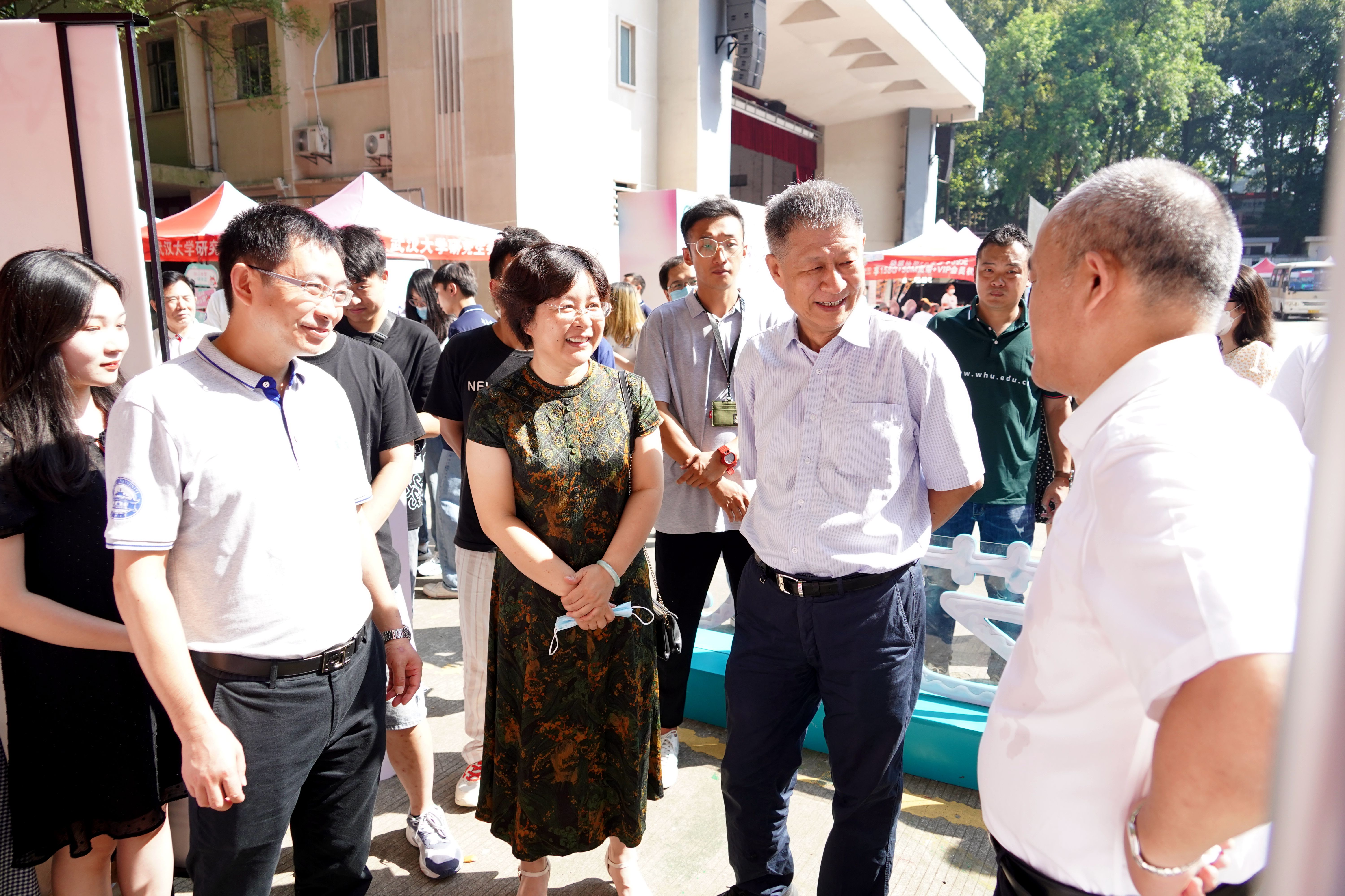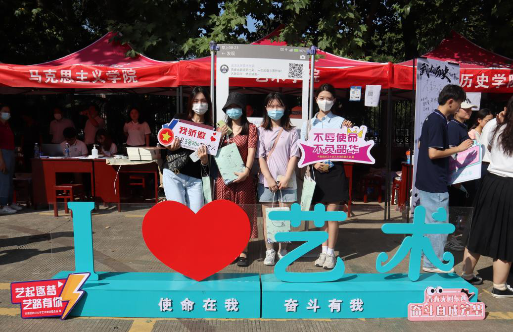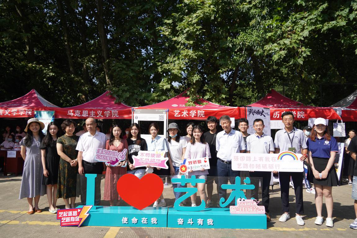 研究生新生们陆续在报到处完成报到,校党委书记韩进、校长窦贤康等校领导一行来到艺术学院迎新点慰问学院师生,并与在场师生合影。