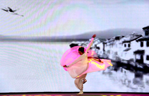 一声笛音,瞬间将在场的各位带到了那“大漠孤烟直,长河落日圆”的茫茫大漠。琵琶反弹来模仿西塔尔琴的声音,正如敦煌壁画上的飞天仙女,高贵端庄,神秘莫测。古筝、中阮、琵琶、竹笛、扬琴、非洲鼓、笙、二胡八个乐器交织在一起,共奏了一曲丝绸之路的长河日圆。