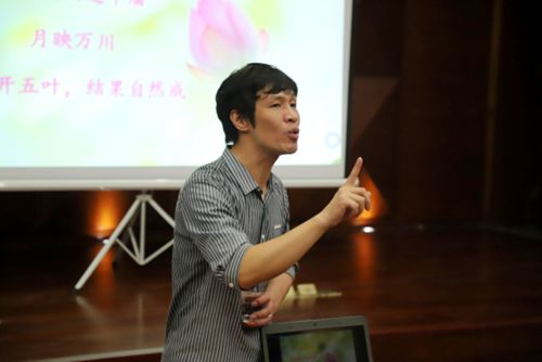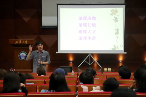 随后易栋老师以“珞珈”“艺境”“人文”“生命”四词解读“璀璨”,以“珞珞如石”引入珞珈校史,讲述闻一多先生更名“珞珈山”的逸事,以历史展现珞珈的刚毅和温婉,以“桂花”、“山月”等珞珈意象展现武大的自然灵秀;又由自然引入武大璀璨的艺术人文气息,劝诫同学们应该学会让生命舒展,提高文化深度,升华气质,改变格调,将璀璨提升到生命的层次,褪去浮华,发现本真。易老师说到深处慷慨激昂,引得同学们掌声不断,喝彩连连。