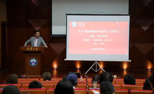 本网讯(通讯员:李郑阳)在隽永着灵秀气息的“物外桃源”,在名家荟萃,大师云集的武大校园里,如何焕发大学四年的价值,是每一位珞珈新主人应该思考的话题。2019年9月29日下午,艺术学院戏剧与影视学系副主任易栋老师为2020级本科新生带来“校史校情”专题讲座,以《涵泳璀璨,如愿芳华》为题目,寄语珞珈新主人,给予艺术学院每一位新生对于珞珈精神和成人教育理念新的启迪。艺术学院党委副书记李海波主持讲座,2020级本科全体新生参与本次讲座。