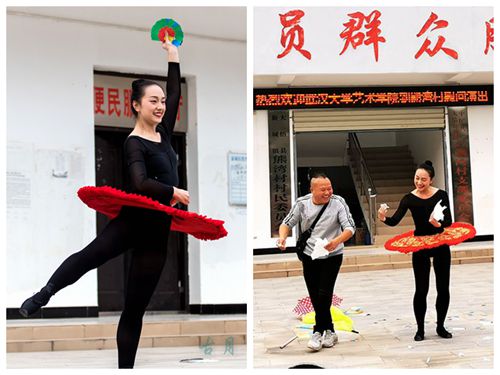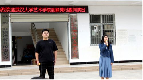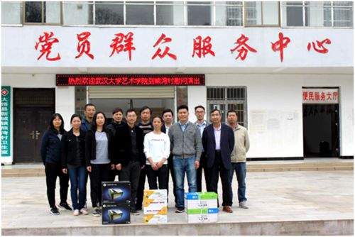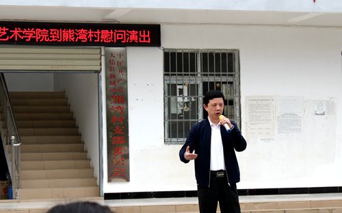 在抵达熊湾村后,大悟县新城镇镇长余喜军,熊湾村党支部书记付玲云,武汉大学派驻村扶贫工作队队长陈春荣、队员孙晓言等干部热情迎接了我们,对我们的到来表示了热烈欢迎和感谢。李海波代表艺术学院向熊湾村党支部委员会进行了简短的捐赠仪式,并指出,艺术学院开展这次慰问演出,是为深入学习贯彻习近平新时代中国特色社会主义思想,推进全面建成小康社会,传播先进文化,开展文艺下乡,为丰富乡亲们的文化生活,让他们在农忙的闲暇时刻能感受到艺术的熏陶。这不仅是温暖和爱心的传递,更是共产党员的责任所在。