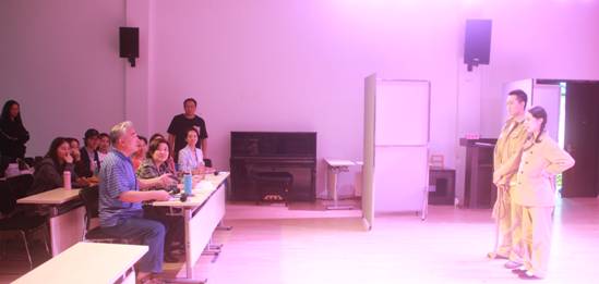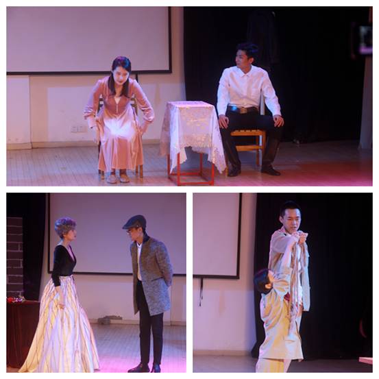 随后,由艺术学院表演专业学生为大家上演了精彩的作品片段展示。首先,2017级表演班学生彭静娴和李启禹在万松玲老师的指导下,为大家展示了经典片段:《荒原与人》。表演过后董怀玉老师对其进行了评价与指导,分别从发声、台词、动作等方面指出两位表演者尚存在的问题,同学们认真听取了意见,从中学习到了很多。紧接着,2015级表演学生张东润和张怡然在周帆老师的指导下,上演了“喀秋莎的旋律”片段之一“华沙曲”,董怀玉老师对其评价较高,但仍指出两位同学在角色诠释方面还需加强。两位表演者没有因高评价而沾沾自喜,而是虚心听取董老师指出的问题并反思,在场的每一位听众都受益匪浅。