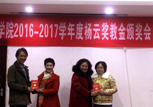 学院副院长刘涛宣读表彰文件,本学年度获奖教师是黄蓓、杨诚和魏尚娥老师,刘丹丽院长和杨云女士共同为获奖教师颁奖。