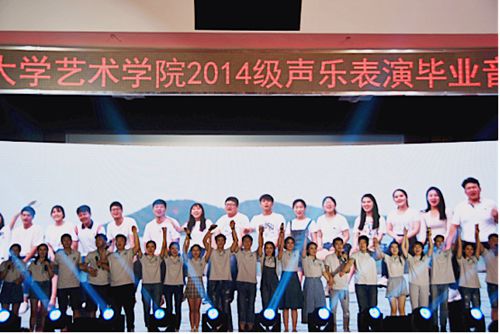 最后一首歌结束,2014级声表班毕业音乐会也落下帷幕,艺术学院刘丹丽院长在熟悉的《有爱才有家》的音乐声中上台致辞,院长在致辞中讲到:“四年前,同学们肩负长辈之托、胸怀赤子之心来到乐动登陆入口,在这里,你们度过了一段激情飞扬的青春岁月,大学生活将成为同学们人生中一段美妙的音符。我希望你们能永远保持一颗进取心,脚踏实地,追求卓越,‘吾生也有涯,而知也无涯’,毕业不是学习的终点,而是一段新的学习征程的开始。祝愿14级声表班的同学们,毕业快乐,前程似锦!”到了要说再见的时候了,即将告别大学这个让人留恋的人生驿站,广阔的前景正展现在你们面前,纵使有太多的不舍,有太多的话想对对方说。此刻,我们把所有的美好定格成一张合照。