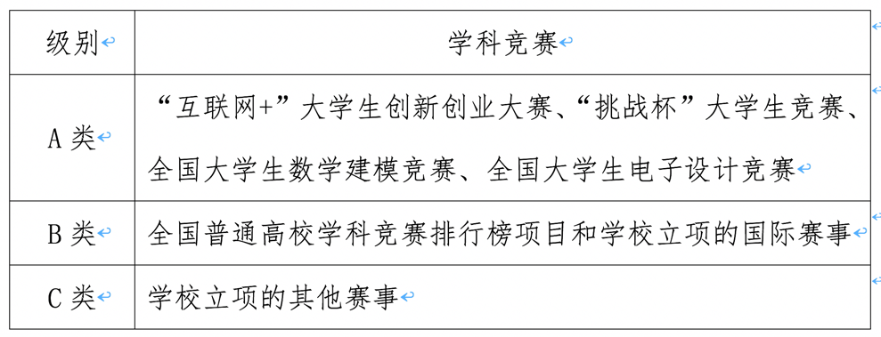 仅限学生作为主力成员(排名前五)参加与学业相关的学科竞赛获奖,学科竞赛有A、B、C三种类型,每个学生B类学科竞赛加分最高不超过学术活动满分的50%,C类学科竞赛加分最高不超过学术活动满分的20%。获奖者必须提供证书原件。同一成果获得不同奖项的,只计最高分。