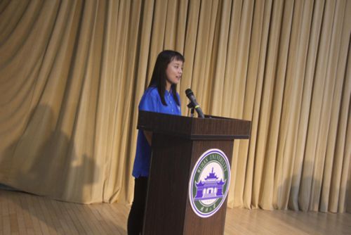 大会第六项,在校生代表、院学生会主席,2016级戏剧影视文学专业雷宇恬同学发言。她用一个“快”字形容了短暂的大学生活,并告诫大家一定要珍惜大学时光。同时还分享了一些专业课的学习经验,鼓励大家兴趣与学业兼顾,积极尝试找到自己的兴趣所在。