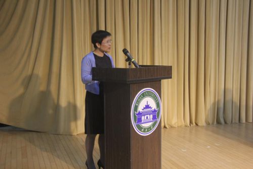 大会第三项,艺术学院教师代表,硕士生导师,2018级戏剧影视文学班级导师杨红菊副教授为大家致辞。杨老师首先为同学们明确了其本职工作——学习。读万卷书,行万里路。鼓励大家在在丰富阅览同时不能停下探寻的脚步。随后杨老师给大家分享了三点建议:多读书,细察人,体会人情,人性,人事;在未来几年的学习生活中接受差异,尊重他人,珍惜自己;杨老师在讲话中多次强调了自律的重要性,高度的自律才会不虚度大学生活的每一天,从而有所收获。杨老师最后以不忘初心,不问西东,不负芳华”作结,与艺术学院全体师生共勉。