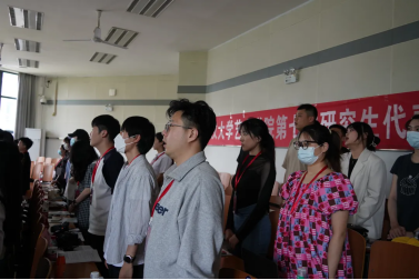 在庄严的国歌声中,大会正式拉开帷幕。艺术学院党委副书记李海波、校研究生会主席团代表常倍铭分别致辞。