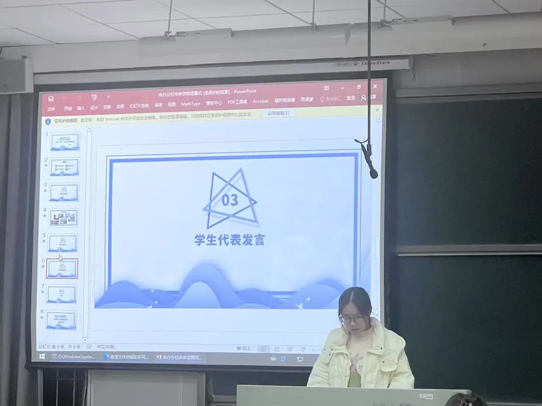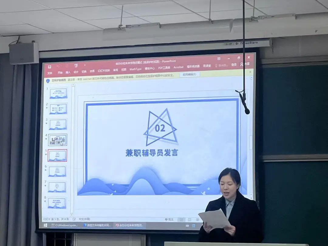 艺术学院兼职辅导员刘畅学姐对大家在未来学院期间展现出的卓越表现进行了表扬,每一句肯定都饱含着对过往努力的认可,每一个微笑都传递着对未来的美好期许。未来学院学生代表刘思倩同学带着满满的热忱与真挚,向大家娓娓道来这段时间的学习心得与收获。